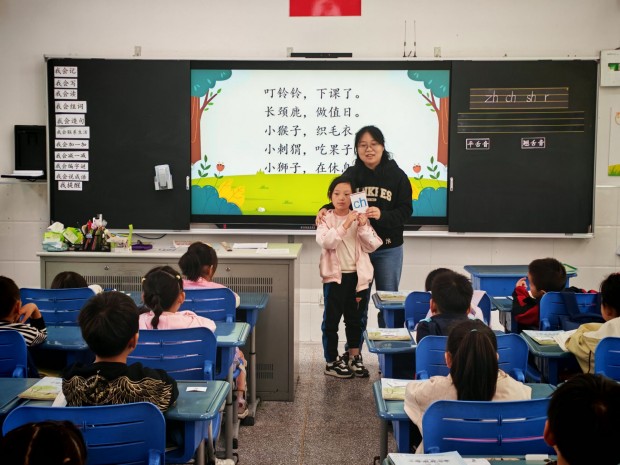 语文组统一教学《zh ch sh r》这一课。课堂上老师们通过图片、儿歌等方式让学生认识这四个声母的形和音,并学习它们的正确发音方法。整节课教学形式多样,包括老师领读、学生跟读、开火车读等练习,还会结合拼音卡片进行拼读小游戏,将声母与韵母相拼,组成音节和词语,以达到巩固和应用的目的。