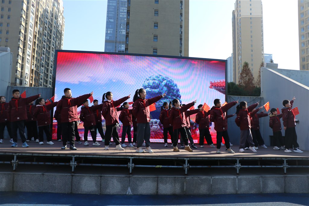 国旗下,五5班同学带来了主题节目表演。朗诵《二十六载来时路》深情回望澳门回归26年来的发展历程,字字句句诉说着澳门与祖国血脉相连、同心同行的深厚情谊;合唱《七子之歌》旋律悠扬、情感真挚,赤子之声回荡在校园上空,让全体师生重温了澳门回归的动人时刻,感受着“一国两制”的伟大实践成果。